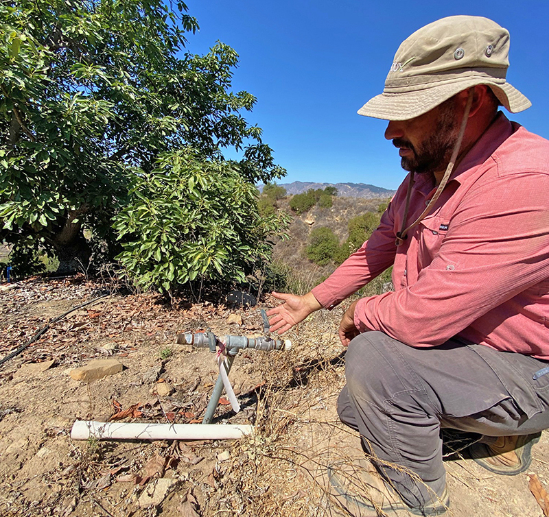 Photo Credit: Nathan Lurie, ranch manager of Brokaw Ranch Co. in Santa Paula, shows water valves to which fire hoses can be attached to water down hot spots from wildfires.