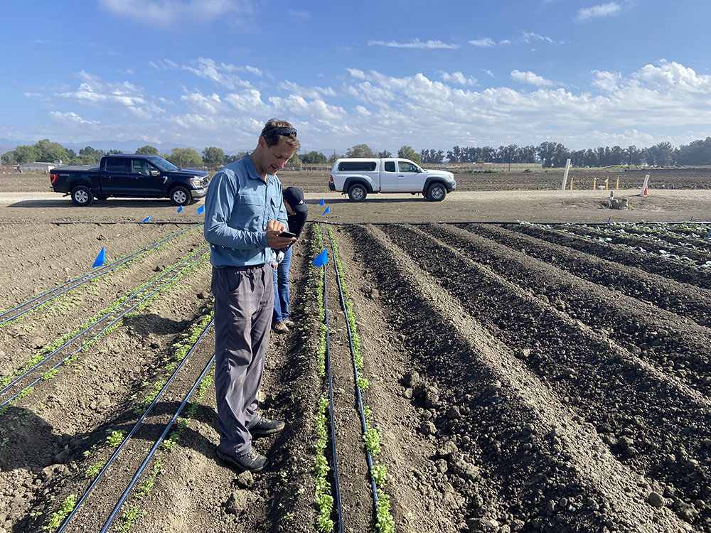 Photo Credit: University of California Cooperative Extension farm adviser Oleg Daugovish checks on cilantro plantings in a trial looking at the effectiveness of the herbicide Dual Magnum against yellow nutsedge weed. The product is currently not registered for use in California on cilantro.