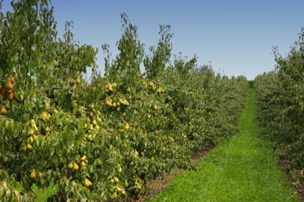 current pear research including insect and disease control, cover crops, mechanization-friendly orchard systems, and breeding.