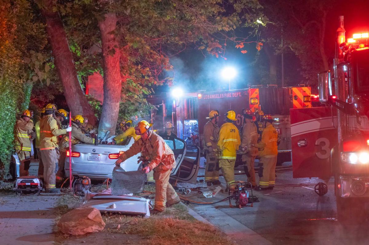 Four people were rescued from a car after it crashed into a tree and burst into flames in Beverly Grove Friday morning. The Los Angeles Police Department said they received a call around 2:30 a.m. about a crash near Beverly Boulevard and North Crescent Heights Boulevard. When officers arrived, they found a car that had crashed into a tree, engulfed in flames. Firefighters from the Los Angeles Fire Department were called to the scene to help extricate the driver and passengers. According to the LAPD, it took firefighters over an hour to free the driver from the car. One person was taken to the hospital in critical condition, while the other three were in stable condition.