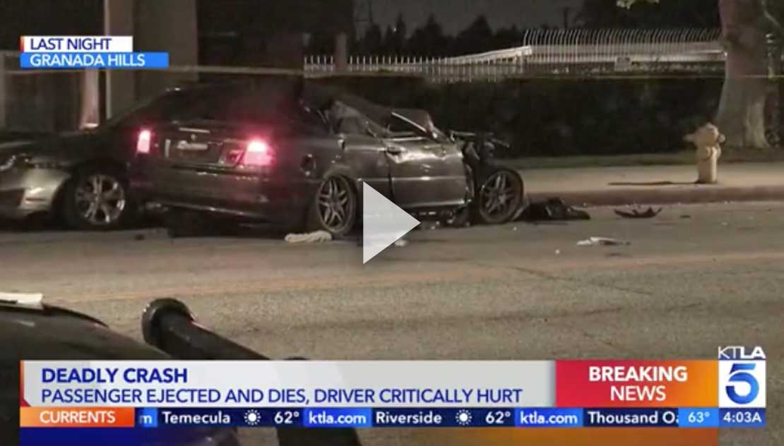 A rollover crash in the Granada Hills neighborhood of Los Angeles left a passenger dead and the driver critically injured Monday night. The vehicle was traveling eastbound on Chatsworth Street near Lindley Avenue just after 9 p.m. when it crashed into the rear of an unoccupied parked car and a parked box truck, a Los Angeles Police Department spokesperson confirmed to KTLA. The car overturned as a result of the crash. An unidentified passenger was ejected and pronounced dead at the scene, the spokesperson said.