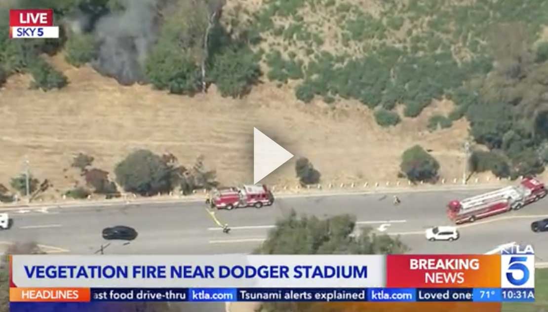 A small brush fire broke out near the entrance to Dodger Stadium Wednesday morning, briefly sending smoke into the air and slowing traffic in the area. The blaze, which ignited near the intersection of Stadium Way and Vin Scully Avenue, burned through about a 100-by-100-foot patch of light brush and grass near the stadium’s parking lot. L.A. City Fire Department crews responded promptly with engine and ladder trucks, pulling hose lines to attack the flames. While the fire briefly spread to some nearby trees, including palm trees, firefighters quickly gained the upper hand. No helicopter support was requested, as ground crews contained the fire efficiently.