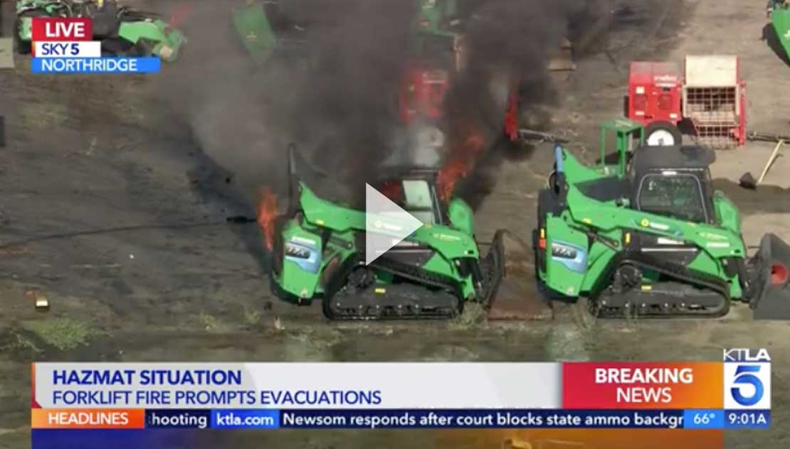 A fire involving an electric skid steer loader prompted an hours-long hazmat response and forced evacuations in Northridge Friday morning. Los Angeles firefighters responded to the fire in the 18200 block of Napa Street shortly after 7:30 a.m. The hazmat team joined the operation when crews determined that the fire was burning in the battery compartment of the Lithium-Ion powered loader, the Los Angeles Fire Department stated in a news release.