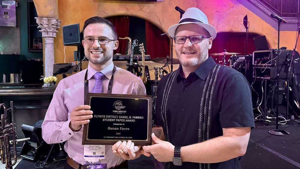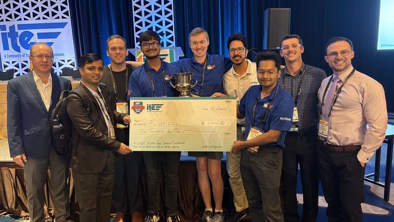 In the Conch Republic, UF researchers and Key West locals join forces for a safer paradise | | Image credit: Adobe Stock | | The streets of Key West always buzz with life. On any given day, you’ll see tourists pedaling past charming pastel-colored cottages, tourists stepping off sunbaked cruise ships wandering about, and roosters – yes, roosters – strutting confidently around town. But beneath all that charm is a serious concern shared by those who live in the City of Key West: Key West’s streets aren’t always safe for its residents and tourists — or even roosters, for that matter. About 17% of residents in Key West rely on walking, biking, or other micromobility – like scooters or e-bikes – to get around. Combine that with more than a million visitors each year on an island only two by five miles wide, and congestion and safety risks quickly escalate. [Read more] | | UF ITE student chapter wins International Traffic Bowl Competition for second time | | From left: Scott Washburn, Abira Aashish, Bryce Grame, Sanidhya Dadia, Michael Panarisi, Fabio Sasahara, Faizur Himel, Michael Hayes, and Renan Favero | The University of Florida Institute of Transportation Engineers (UFITE) Student Chapter recently claimed its second T-Bowl title in 12 years. The competition was held on Aug. 11 during the ITE Annual Meeting in Orlando. Modeled after TV’s “Jeopardy,” the ITE International Collegiate Traffic Bowl – known as the T-Bowl – brought together 10 teams from the United States and Canada, including Brigham Young University, New York University, Penn State, Purdue University, Texas A&M, University of British Columbia, University of Kansas, University of Washington and Virginia Tech. UF’s victory brought home the championship trophy and a $1,000 prize. [Read more] | | Doctoral student wins ITE District Best Paper Award for autonomous shuttle study | | From left: Renan Favero and Eric Gordin, P.E., president of the FLPRITE district chapter | | Congratulations to Renan Favero for winning the Daniel B. Fambro Student Paper Award at the Florida-Puerto Rico Institute of Transportation Engineers (ITE) District Annual Meeting in Orlando, Florida. Favero is a transportation engineering doctoral student conducting research on autonomous shuttles. The award-winning paper titled “Exploratory Driving Performance and Car-Following Modeling for Autonomous Shuttles Based on Field Data” evaluates autonomous shuttle trajectories with a specific focus on traffic operations and user comfort. [Read more] | | Students win 3-Minute Pitch at the ITE International Annual Meeting in Orlando | | From left: Amy Aida, Gustavo Zschaber, Bryce Grame, Yasmine Al Moghrabi, Enock Mwambeleko | Bryce Grame and Gustavo Zschaber, both University of Florida civil engineering graduate students specializing in transportation engineering, won first place during the 3-Minute Student Pitch Competition held as part of the Institute of Transportation Engineers (ITE) International Meeting in Orlando, Florida, Aug. 10 – 13. This year, the ITE conference incorporated the Shark-Tank-like competition into its program, challenging students to come up with persuasive pitches on innovative solutions to transportation challenges. Students had three minutes to deliver their ideas in front of a panel of judges who questioned students on scalability, user adoption and integration into the overall transportation systems. [Read more] | | Transportation Technology Transfer (T2) Center | | |