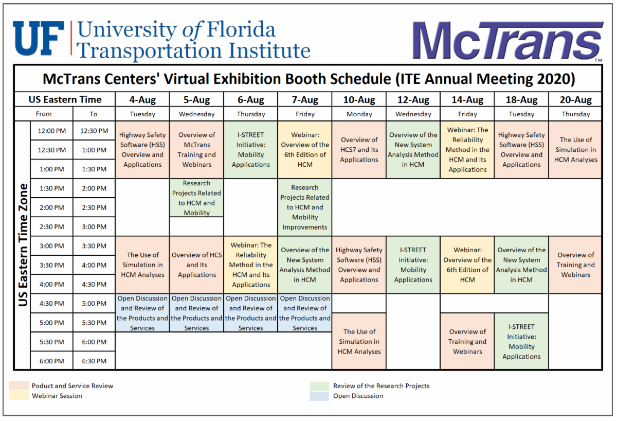 The McTrans virtual program for ITE2020 includes product reviews, webinars, and research presentations related to the Highway Capacity Software (HCS), Highway Capacity Manual (HCM6) and mobility analysis.