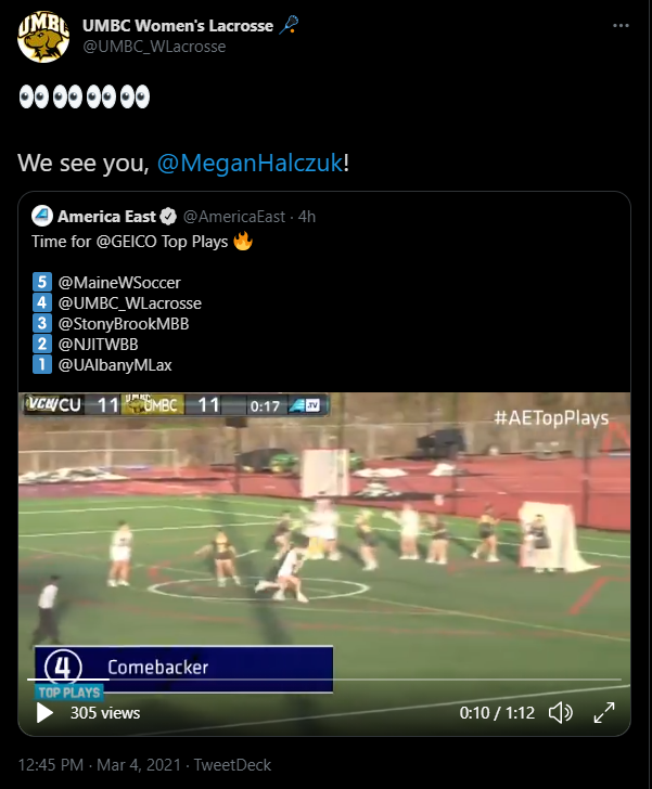 We get to a lot in these newsletters, but if you need your UMBC Women's Lacrosse news up-to-the-minute, be sure to follow UMBC Women's Lacrosse (@UMBC_WLacrosse) and UMBC Athletics (@UMBCAthletics) on Twitter, and visit UMBCRetrievers.com.