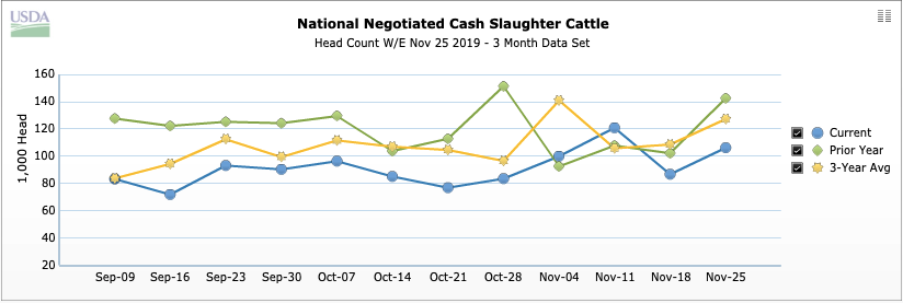 publishes agriculture price for a number of commodities throughout the US. Here is the latest cattle dashboard graph showing the current, last year and three year average of live cattle.