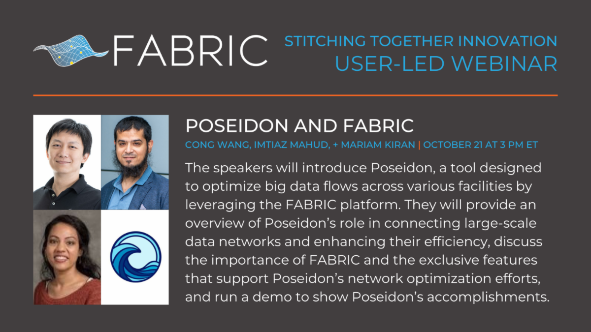 Join us on October 21, from 3 - 4 PM ET, for an insightful webinar on “Poseidon and FABRIC” featuring Cong Wang, Imtiaz Mahud, and Mariam Kiran as they introduce and demonstrate Poseidon, a tool designed to optimize big data flows across various facilities by leveraging the FABRIC platform. This session will begin with a concise overview of Poseidon’s capabilities, highlighting its role in connecting large-scale data networks and enhancing their efficiency. The presenters will discuss the importance of FABRIC and the exclusive features that support Poseidon’s network optimization efforts. The tutorial will include a demo showcasing what Poseidon is accomplishing and how FABRIC users can benefit from it, featuring a video by Imtiaz Mahud. Those interested can register here.