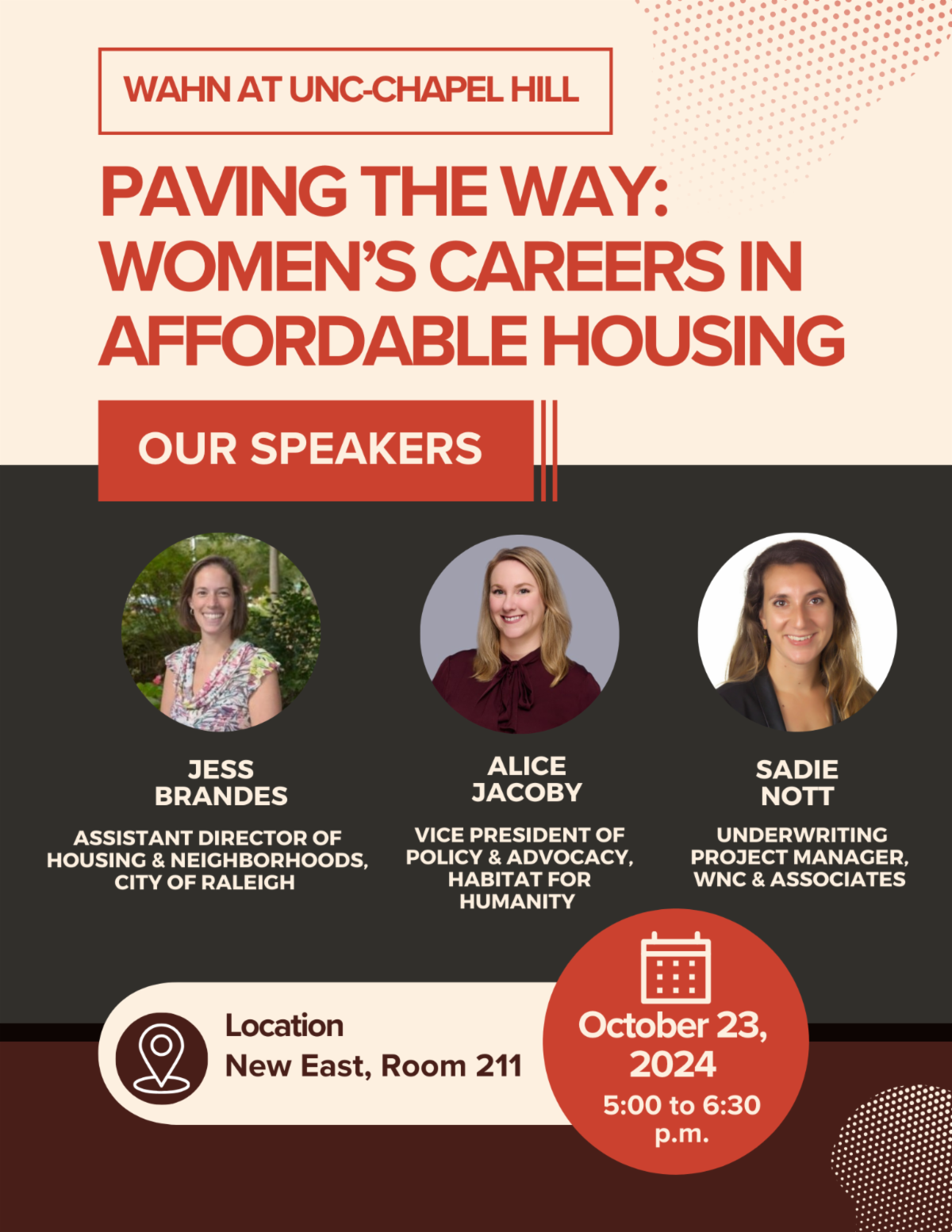 Next Wednesday, October 23rd, from 5:00 to 6:30 p.m., the Women's Affordable Housing Network (WAHN) at UNC-Chapel Hill will be hosting a panel discussion titled "Paving the Way: Women's Careers in Affordable Housing."