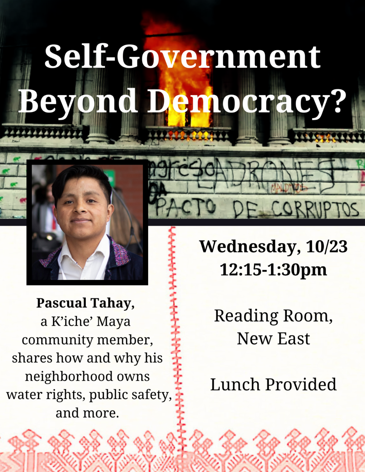 I’d love to invite students in the MPA program as well as any interested School of Government staff and faculty to an event with City and Regional Planning. I hope some of you can make the hike up through campus for a lunch and conversation with an indigenous K’iche’ Mayan about his community’s form of government in Guatemala.