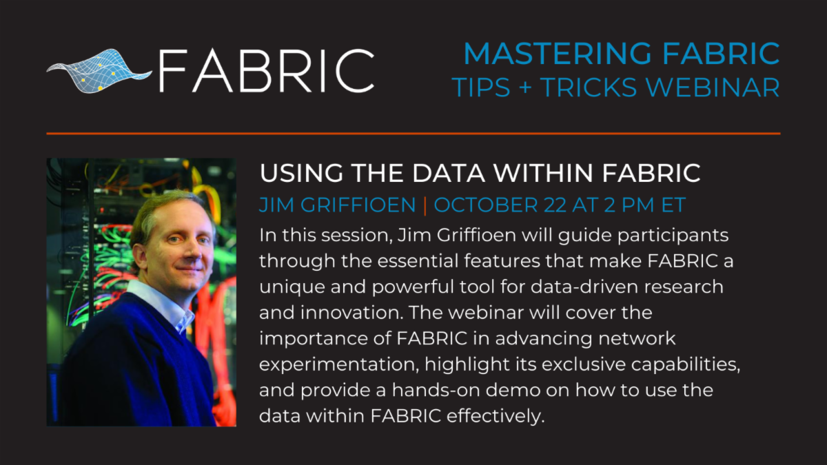 Join us on October 22, from 2 - 3 PM ET, for “Using the Data Within FABRIC,” a deep dive into utilizing a wealth of data measured on the FABRIC platform. In this session, Jim Griffioen will guide participants through the essential features that make FABRIC a unique and powerful tool for data-driven research and innovation. The webinar will cover the importance of FABRIC in advancing network experimentation, highlight its exclusive capabilities, and provide a hands-on demo on how to use the data within FABRIC effectively. The session will also offer valuable resources for further exploration. Those interested can register here.