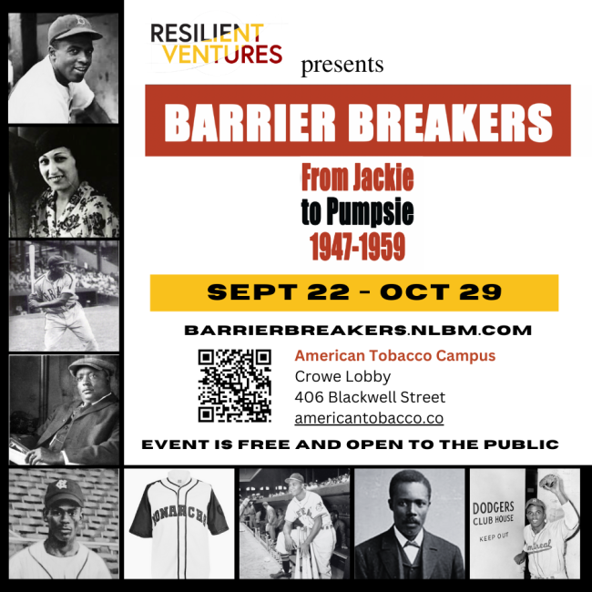 Resilient Ventures is thrilled to bring the captivating exhibition, "Barrier Breakers," from first Dodger Stadium then Boston and now to the Triangle. This remarkable exhibit, hosted at the Crowe Building on the American Tobacco Campus, is curated by the Negro Leagues Baseball Museum (NLBM) and unveils the profound narrative of baseball integration, Black Business excellence, and its pivotal role in Civil Rights history. A virtual exhibit is also available.