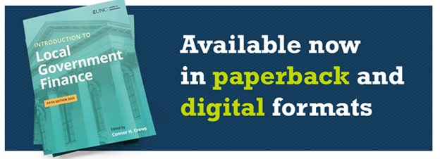 Now in its fifth edition, this book introduces readers to these key legal rules affecting local government finance and basic principles of revenue forecasting, budgeting, governmental accounting, and financial management. It continues to serve as the textbook for Introduction to Local Government Finance, the foundational course of the UNC School of Government’s local government finance curriculum. Like that course, this book is a joint effort among School faculty members whose areas of focus include local government finance. Unless otherwise specified in a given chapter, it reflects statutory provisions and case law through July 1, 2023.