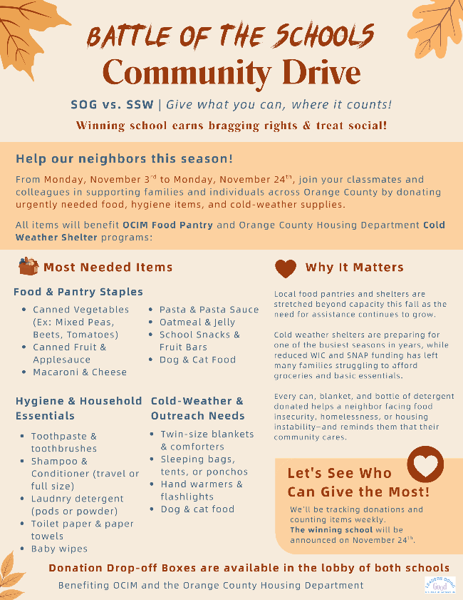 It’s time for a little friendly competition for a great cause! The School of Government (SOG) and the School of Social Work (SSW) are going head-to-head in our Battle of the Schools: Community Drive — a campus-wide effort to support Orange County families and neighbors in need this season.