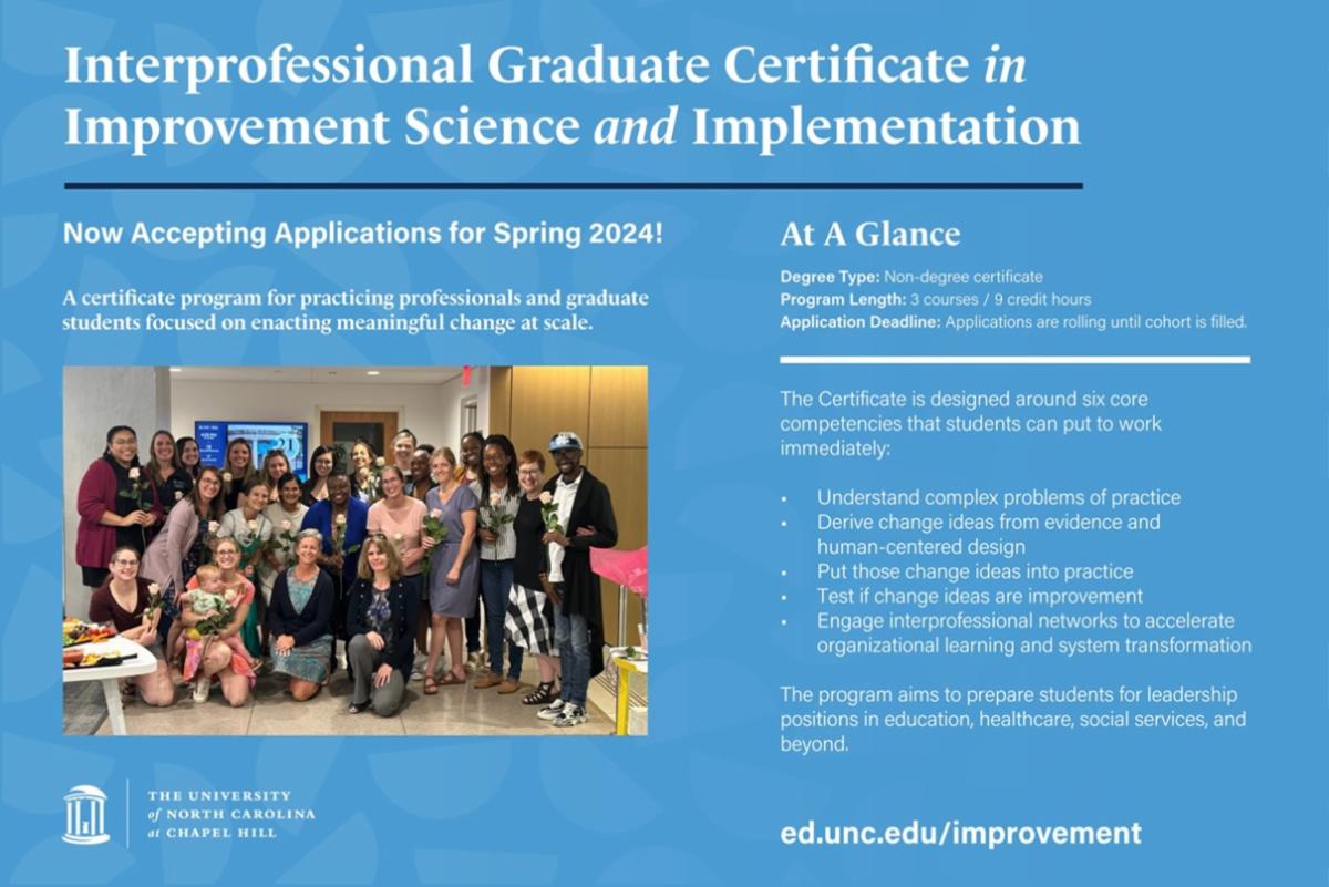 The Interprofessional Certificate in Improvement Science and Implementation at UNC, Chapel Hill has only 10 spots left in our 2024 cohort! Applications are reviewed on a rolling basis.