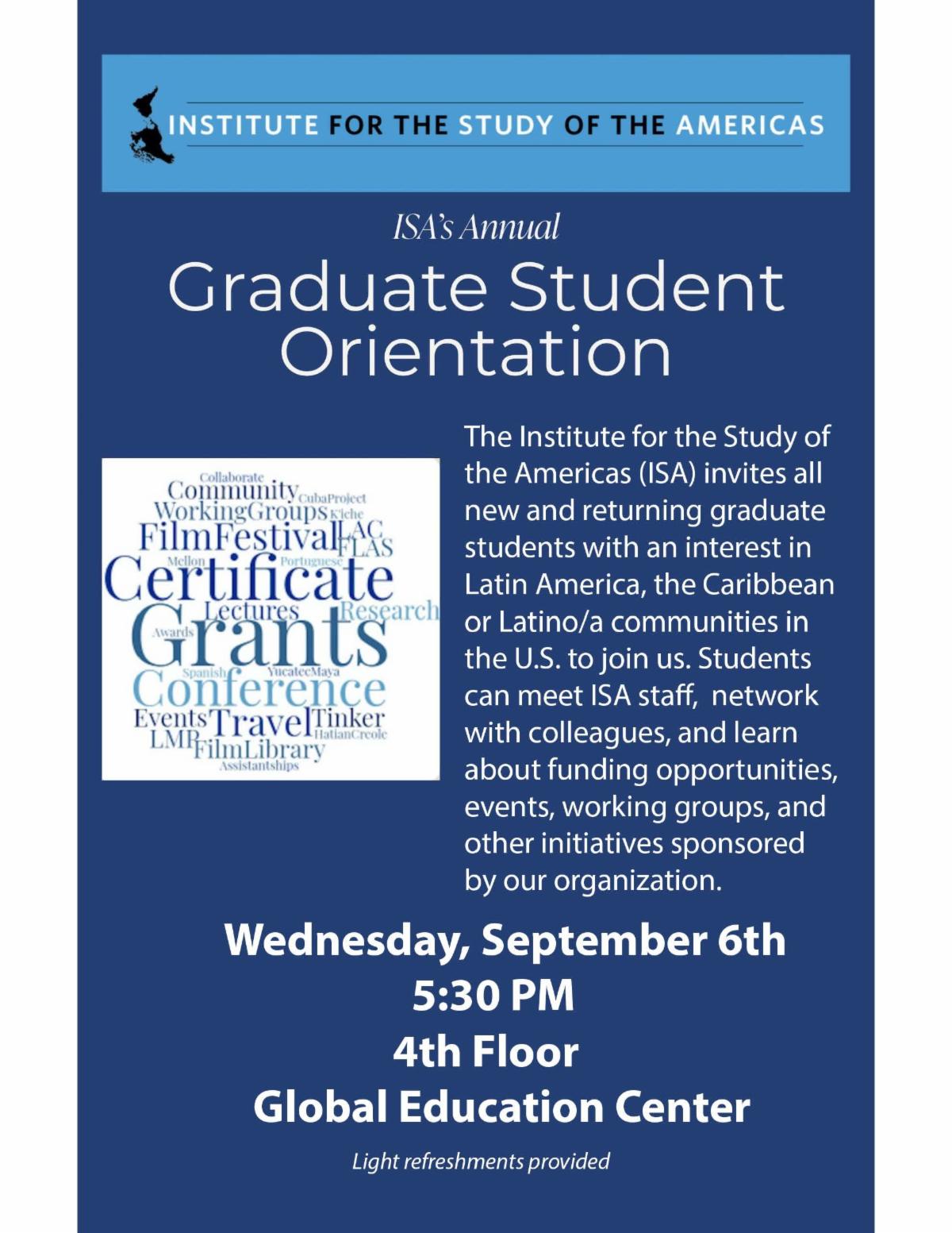 The Institute for the Study of the Americas (ISA) is holding our annual Graduate Student Orientation on Wednesday, September 6th at 5:30pm in the 4th floor of the Global Education Center (GEC). This is an opportunity for graduate students with an interest in Latin America or Latino/a communities in the US to meet other graduate students and learn about funding opportunities and other initiatives sponsored by our organization. We look forward to seeing you!