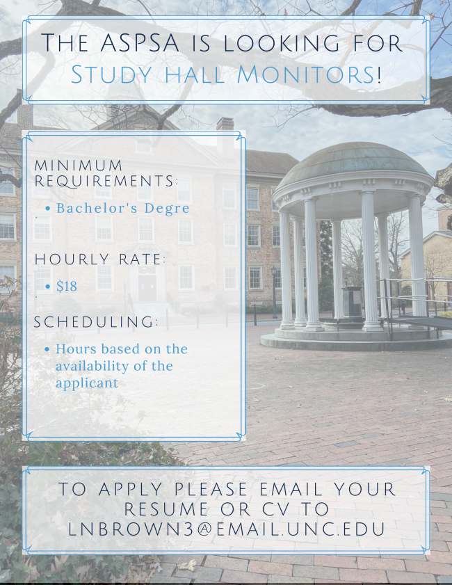The UNC Academic Support Program for Student Athletes (ASPSA) is looking for study hall monitors for the upcoming school year. The job, which pays $18 an hour, has flexible hours and involves monitoring student athletes who are assigned to complete study hall hours. There's no learning support (tutoring or teaching) involved, so applicants do not need a background in tutoring to work in this position as they will be working with students who are studying independently. Students can work as few or as many hours as they would like each week in this position. Please contact Dr. L. Neal Brown, Learning Specialist, with questions or to apply with resume/cv. | | | | |