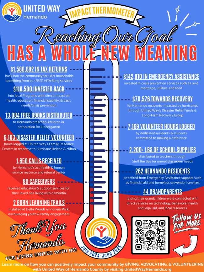 Because of you, reaching our goal has a whole new meaning. At United Way, we don't focus on the amount of dollars raised, but rather what those dollars were able to do for the community. Thanks to you believing in United Way of Hernando County's mission, you directly impact our ability to provide essential services and support to those facing challenges in Hernando.