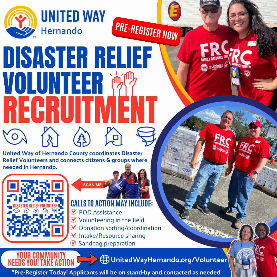 United Way is in need of compassionate, reliable volunteers to pre-register their support towards relief efforts before, during, & after a storm. United is the Way to community resiliency.
