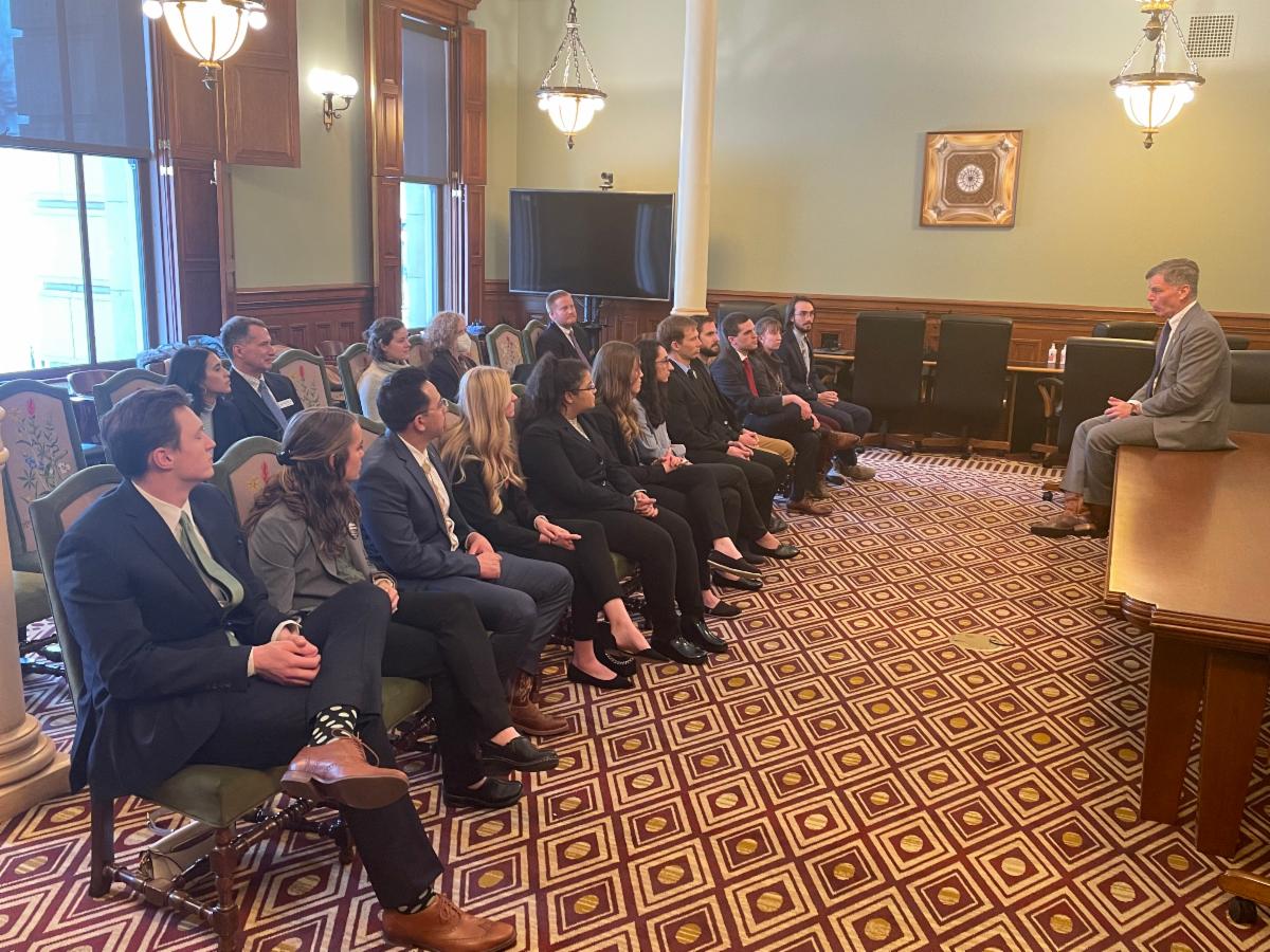 Each year, the Legislature looks forward to WWAMI day at the Capitol. Students of the current first-year class convene in Cheyenne for a legislative lunch, introductions in the House and Senate, and private meeting with the Governor (pictured above). This year's group was fortunate enough to be invited onto the Senate floor by Former Senate President Drew Perkins (R-Casper) and were later cheered and praised in the House of Representatives after a warm introduction from Minority Floor Leader Cathy Connolly (D- Laramie).