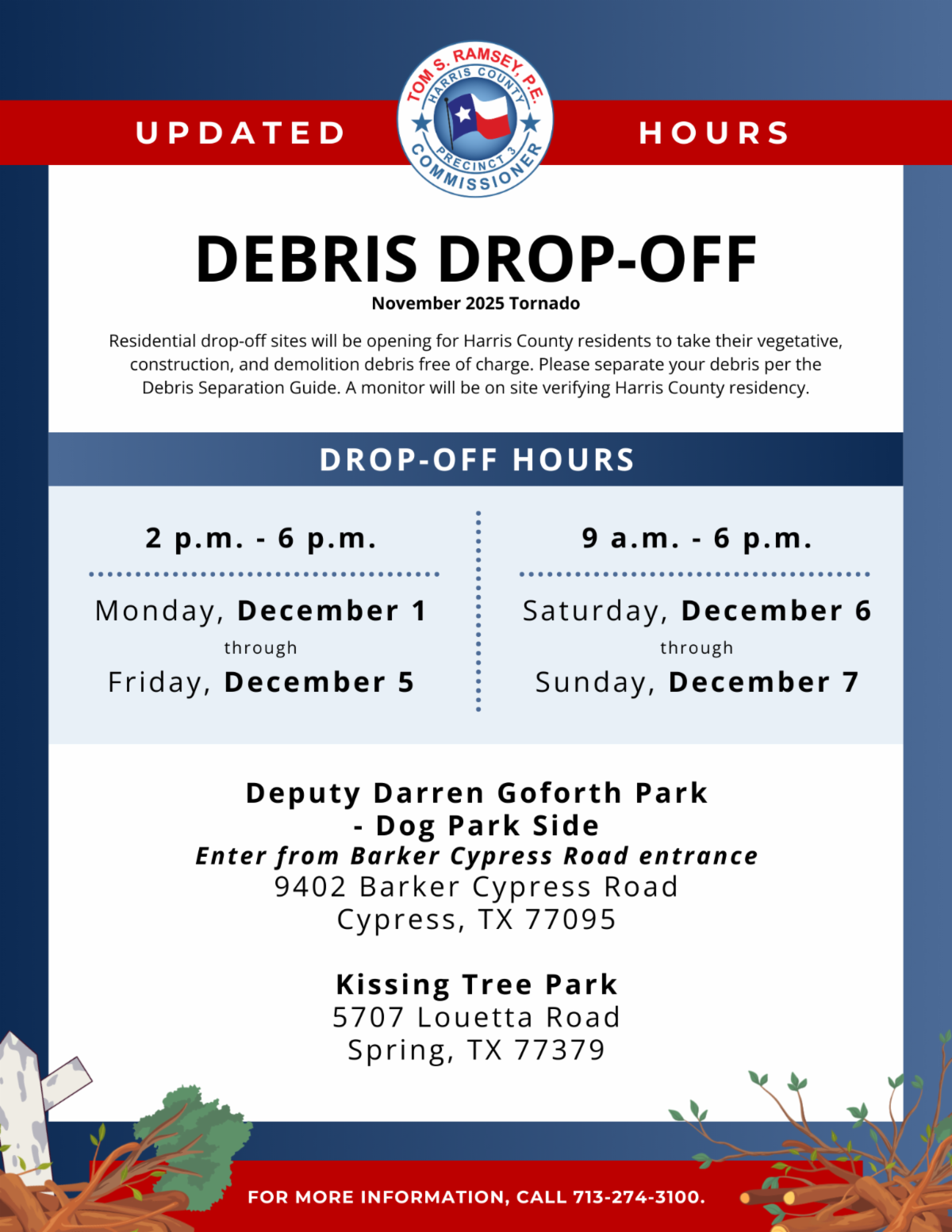 Please note that hours have been updated for these temporary debris drop-off locations for Harris County residents affected by the tornado.