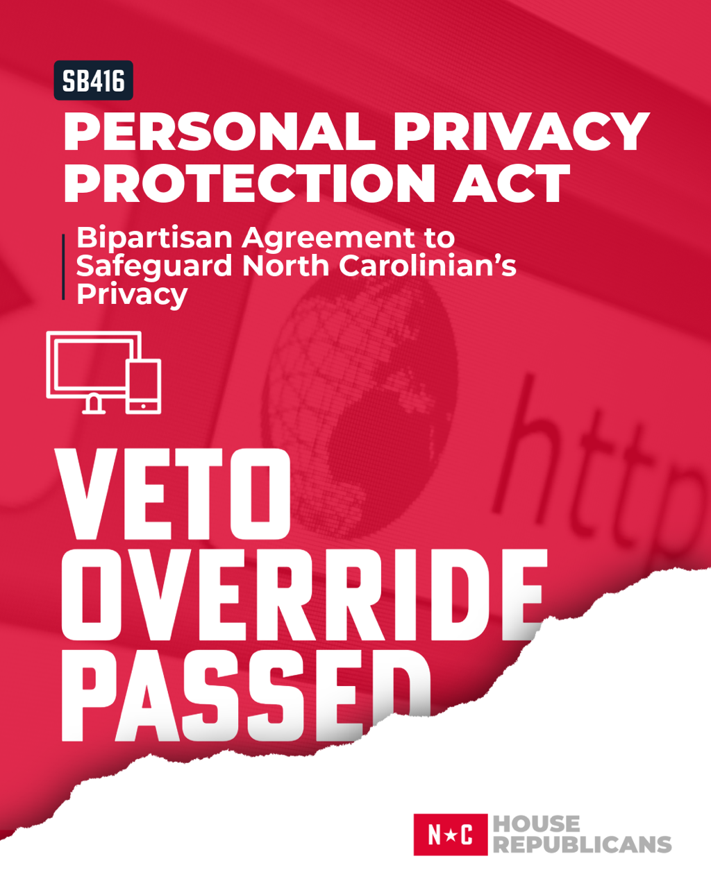 SB 416, The Personal Privacy Protection Act, was also overridden. This bill will prohibit public agencies from collecting, disclosing, or releasing information about donors, members, and volunteers of a non-profit organization. This piece of legislation will help keep the privacy for people in NC.