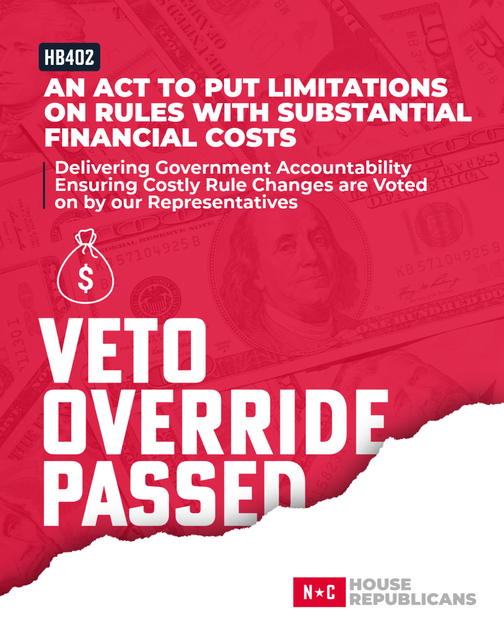 HB 402, Limit Rules with Substantial Financial Costs, was put into law after Governor Stein's veto was overridden. This piece of legislation will save taxpayers money and prevent bureaucratic waste.