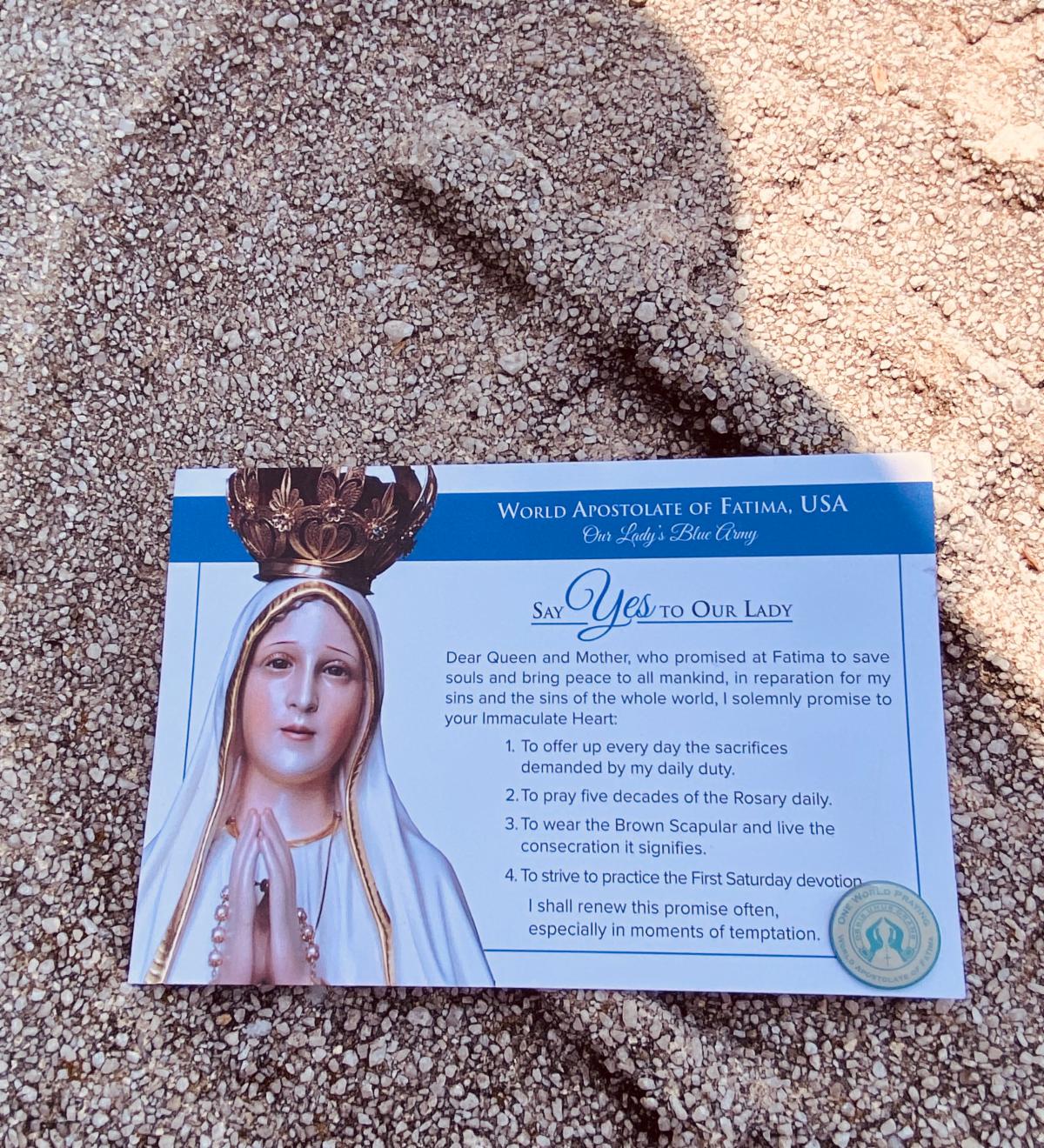 Say Yes to Our Lady! I wish to be counted among the millions of people around the world who are participating in Our Lady’s plan for the salvation of souls and world peace and to have my name placed at the site of the apparitions as a sign of my intent to honor her Fatima requests and so that I will be prayed for there.