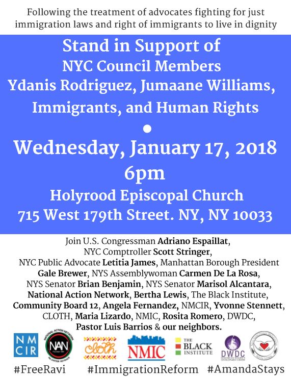 en apoyo a los Concejales Ydanis Rodríguez y Jumaane Williams, y defensores pro-inmigrantes arrestados el Jueves de la semana pasada en apoyo a Ravi Ragbir. Ravi, quien dirige New Sanctuary Coalition junto con Jean Montreveil, también en proceso de deportación, representa a los casi 13 millones de personas indocumentadas que viven en los Estados Unidos. La fecha coincide con los seis meses desde que Amanda Morales-Guerra buscó refugio en la Iglesia Santa Cruz o Holyrood en Washington Heights.