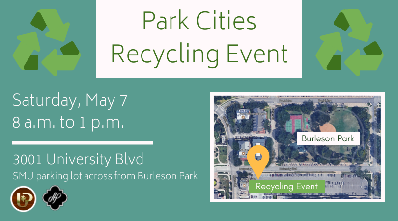 The next Park Cities recycling event will take place in the SMU parking lot on the south side of Burleson Park on Saturday, May 7 from 8 a.m. to 1 p.m.