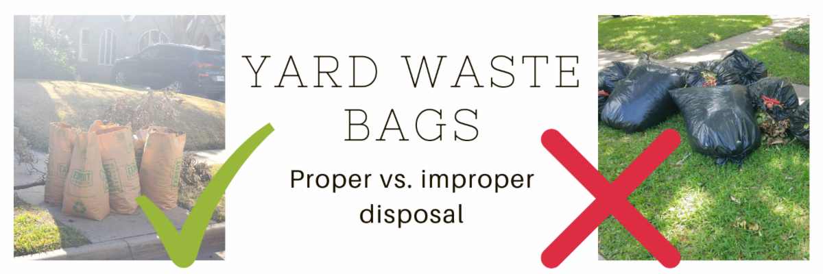 If you have brush, leaves, or grass clippings that need to be disposed of, please place the waste in a proper biodegradable paper yard waste bag (see photo). After the Sanitation department picks it up, the yard waste is sent to a compost facility that cannot process materials such as plastic. Proper yard waste bags may be purchased at home improvement stores, including Lowe's, Home Depot, or Target, and they can also be found on Amazon!