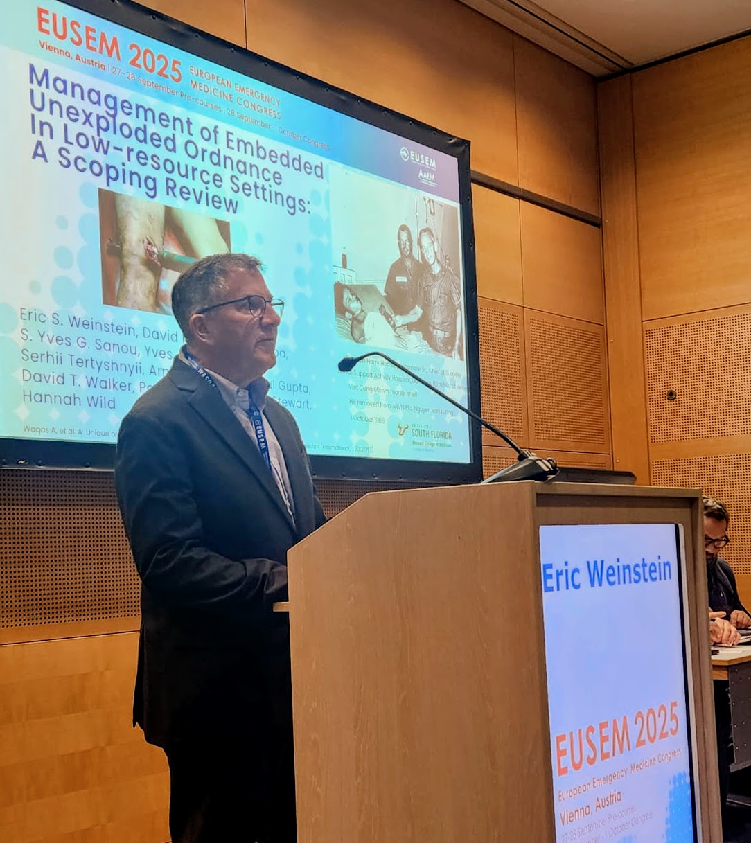 CAMLS proudly recognizes Dr. Eric S. Weinstein, MD, MScDM, Assistant Director for Disaster Medicine Programs, for his expanding international impact in disaster medicine. He was recently invited to deliver an oral presentation at European Emergency Medicine Congress- EUSEM 2025 in Vienna, sharing a PRISMA-scoping review on managing embedded unexploded ordnance in low-resource and humanitarian settings. His findings emphasize the need for coordinated multidisciplinary care and updated clinical guidance.
