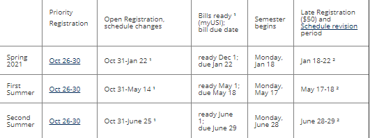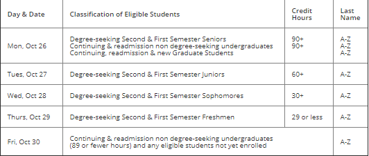 Students are encouraged to register at their earliest opportunity. If you cannot register on the assigned day, you may do so on any subsequent priority registration day. Refer to the Registration Schedule for additional opportunities to register during the Open Registration period.