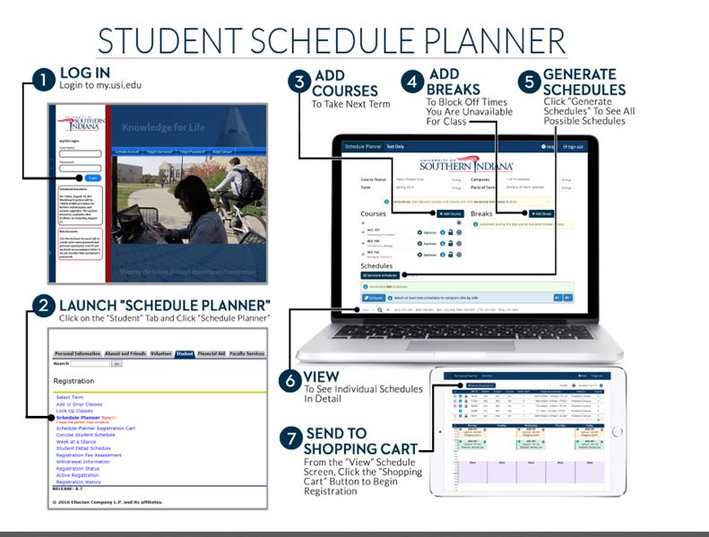Schedule Planner streamlines online registration and helps students build their ideal class schedule. It integrates with DegreeWorks and is accessible from both PC, Mac, and mobile devices. Students access the planner from their myUSI account. After logging in, click "Student" then "Registration," then select "Schedule Planner" from the list.