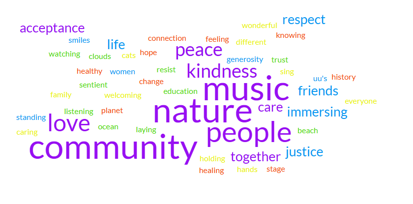 At the Annual Pittsburgh Cluster Assembly, Rev. Lee Anne invited those gathered to write on the back of paper doves what concerns were weighing heavy on their hearts. On the front, she invited them to write what gives them peace, which can also be expressed as what does peace look like. On the Sunday immediately following the assembly, Rev. Lee Anne asked the same of our congregation. To the left is an image of the mural with the doves.