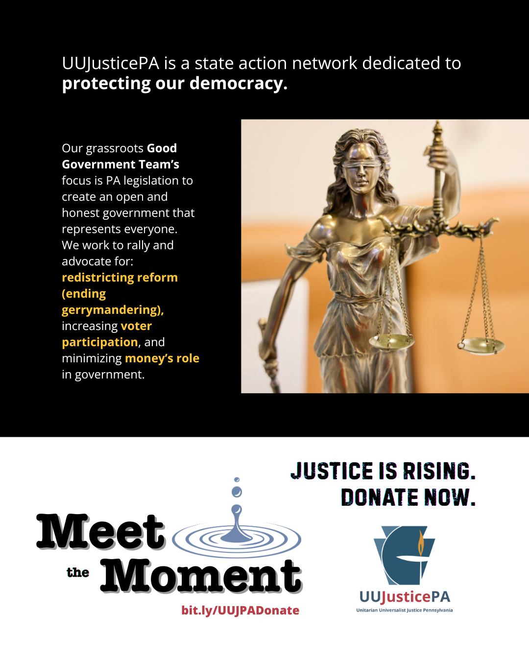 UUJusticePA’s Good Government Team, grounded in UU Principle #5, works to protect democracy in Pennsylvania through fair maps, ethical governance, and expanded access to the ballot — including support for vote-by-mail.