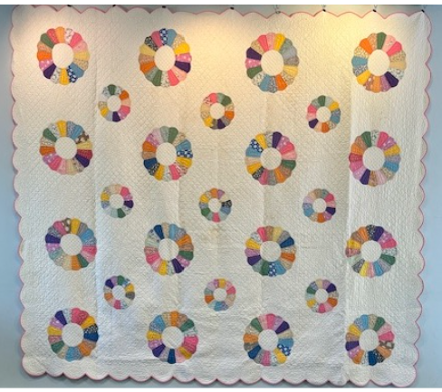Before her move to Ohio, Ginny Love, long time UUCNH member, generously donated a beautiful, multi-color Dresden Plate quilt to the Craft Group to raise money for the church. It has been in Ginny's family for years, but she doesn't believe it was made by a family member. It has probably been washed only once.