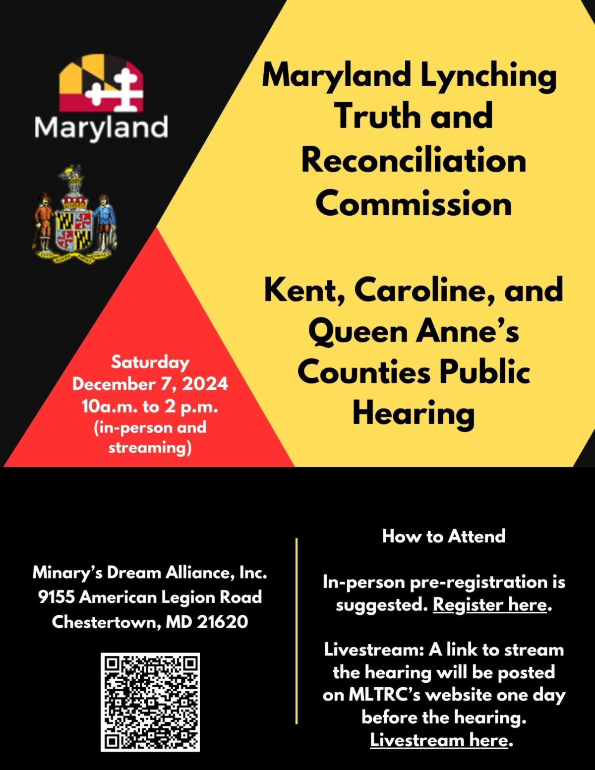 To register to attend the Maryland Lynching Truth and Reconciliation Commission's public hearing either in-person or by livestream, please CLICK HERE, as the links on the flyer are not active.