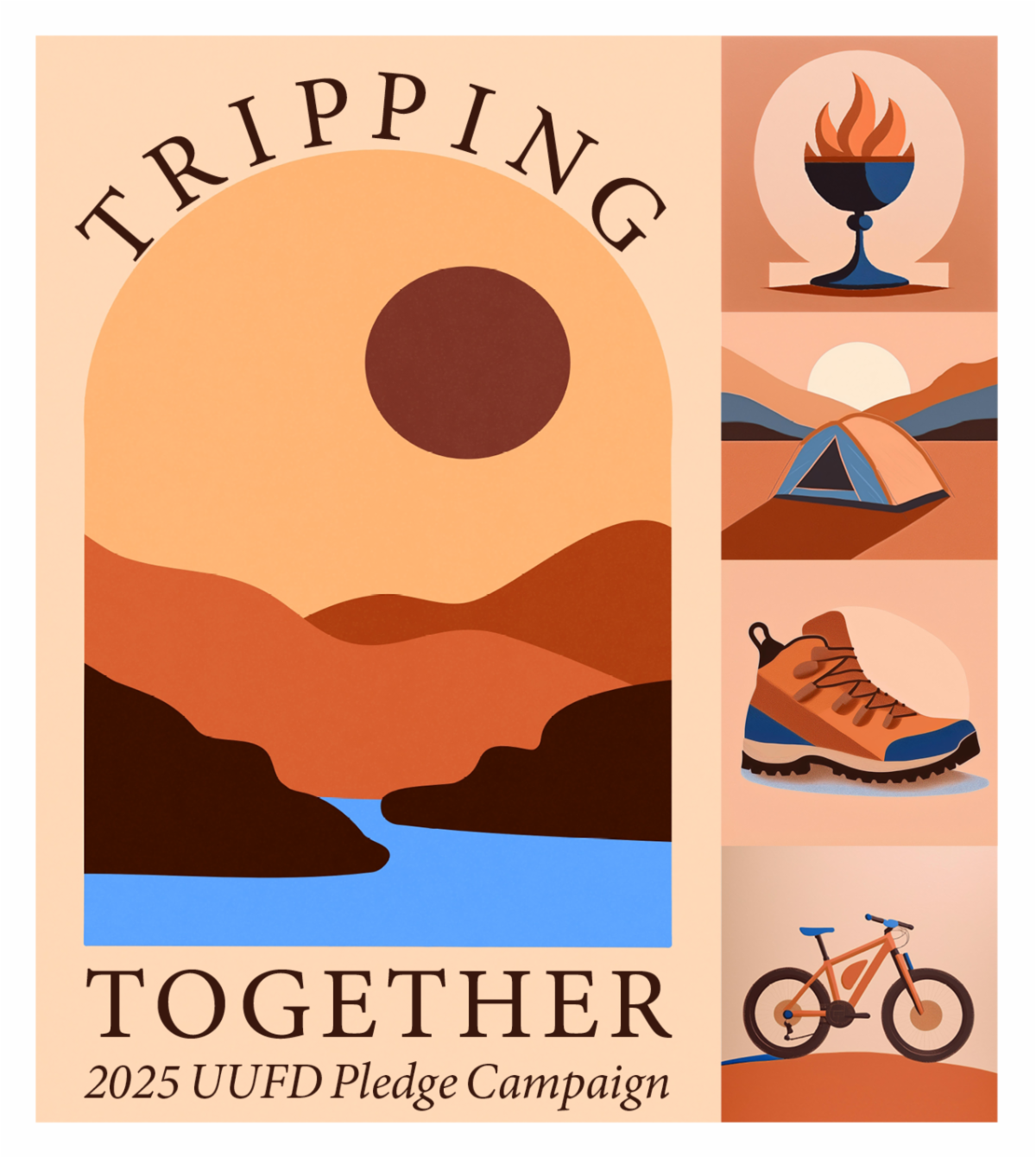 We are all on a spiritual trip together as a community, united by activities that strengthen our community, here in our town built around a river. The river is metaphorically our life's journey, the church is our spiritual journey. Some of the many outdoor activities available to us as a community are pictured on the logo as well as the river and mountains that surround us. Thus, we are Tripping Together.