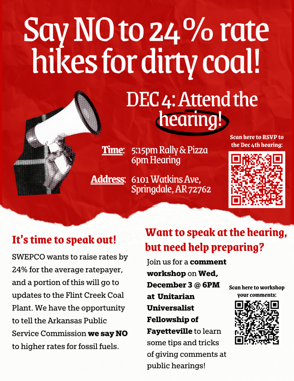 Please mark your calendars for the upcoming public comment hearing for SWEPCO’s Arkansas territory rate proceedings. The hearing will be held Thursday, December 4, 2025 at 6:00 p.m. at the campus of Northwest Arkansas Community College (NWACC), 6101 Watkins Avenue, Springdale, AR 72762. SWEPCO