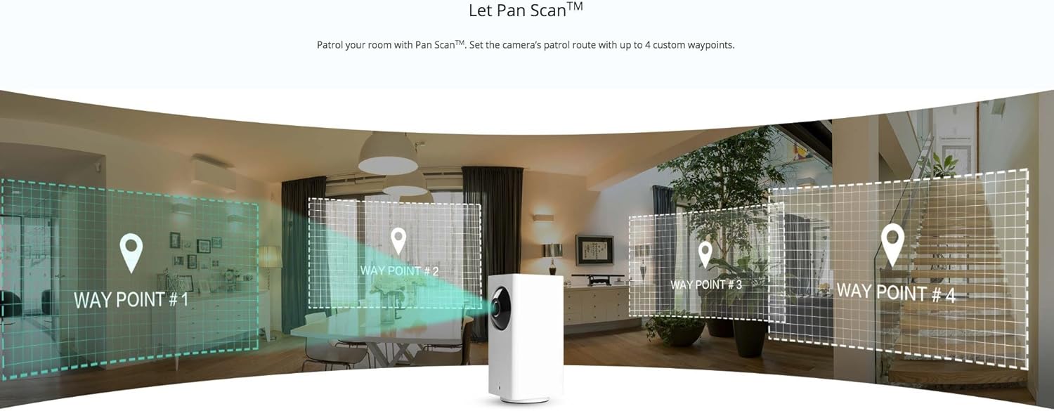 • Pan, tilt, and zoom (PTZ) lets you control Wyze Cam Pan remotely using the Wyze app so you can see every angle of your room while you’re away, on demand. Or, have Wyze Cam Pan monitor your room automatically with the Pan Scan feature by setting 4 predefined waypoints. Panning has a 360° left/right rotation range and tilting has a 93° vertical up/down range.