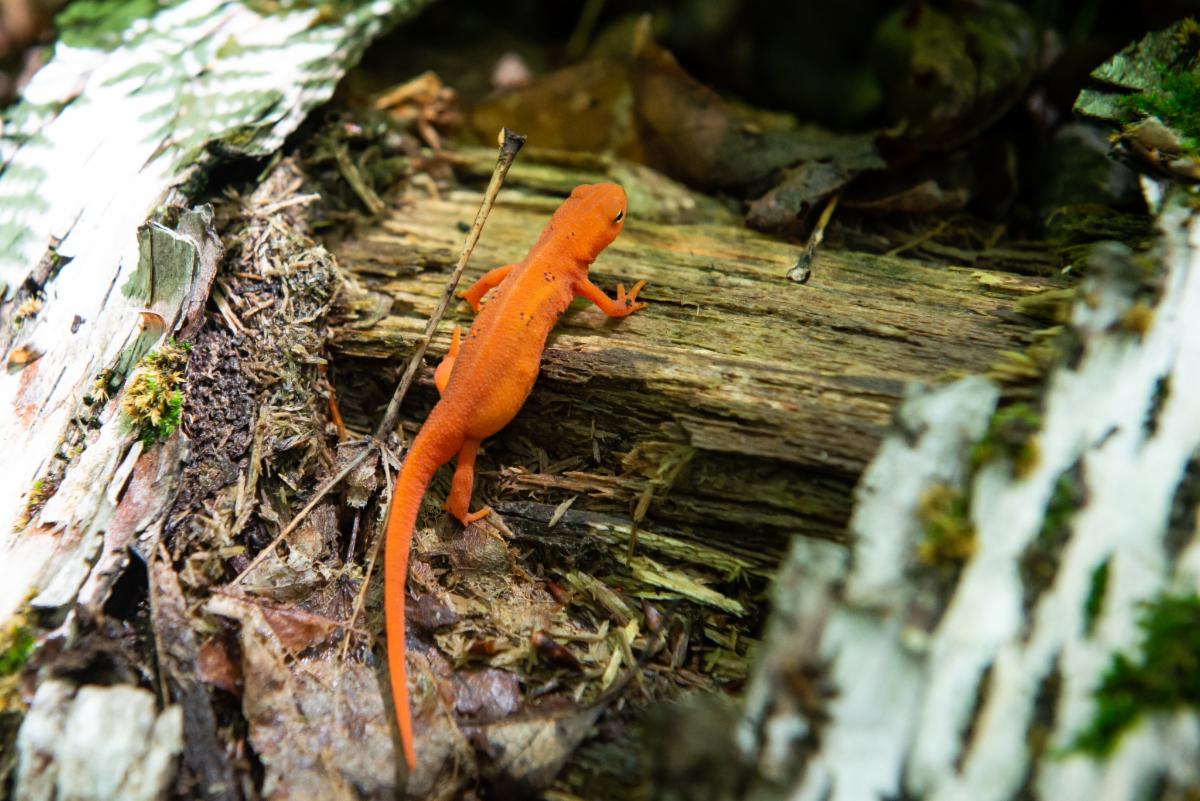 | Eastern newt (Notophthalmus viridescens) in the red eft (juvenile) stage walking over a log. Photo Credit: Tom Rogers~iNaturalist | | |