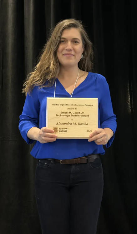 | Dr. Alexandra Kosiba accepting award at New England Society of American Forester's Winter Meeting 2026. Media Credit: Ren Dillon~ UVM | |