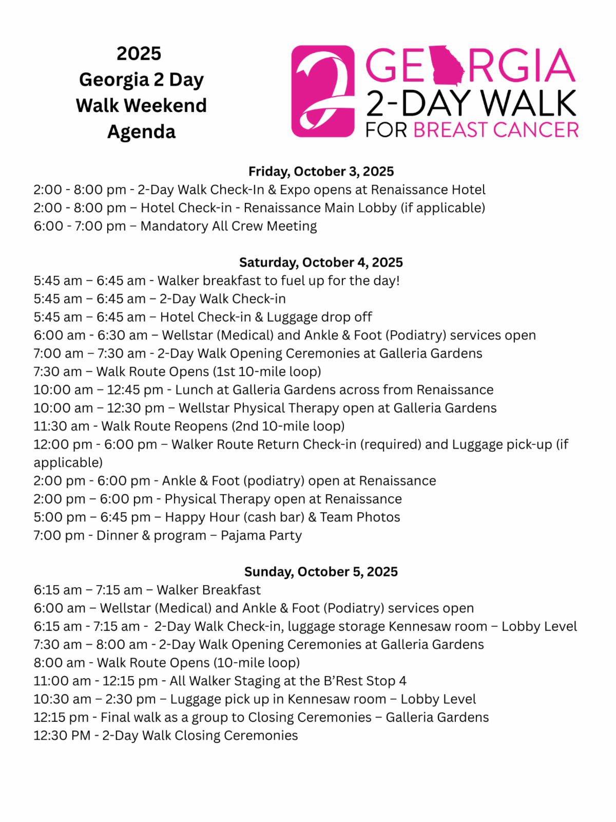 The 2025 Ultimate 2-Day Walk Guide! | | This is it - the 2025 Ultimate 2-Day Walk Guide! This is the email to flag, star, print, highlight, etc., and has ALL the crucial information you need to have a successful Georgia 2-Day Walk for Breast Cancer. DO NOT DELETE this email! You will need it! | |