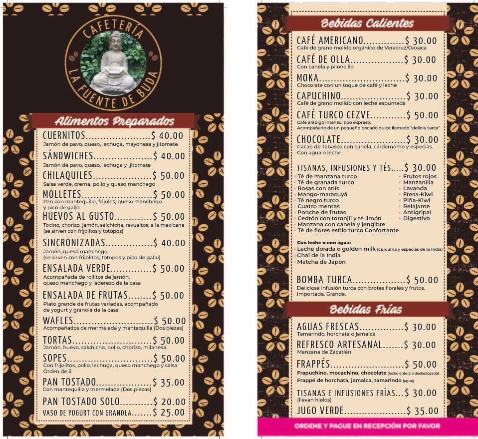 Durante los cursos se dan 30 minutos de receso. Contamos con cafetería en el jardín, para su comodidad y agradable estancia (adjuntamos el menú).
