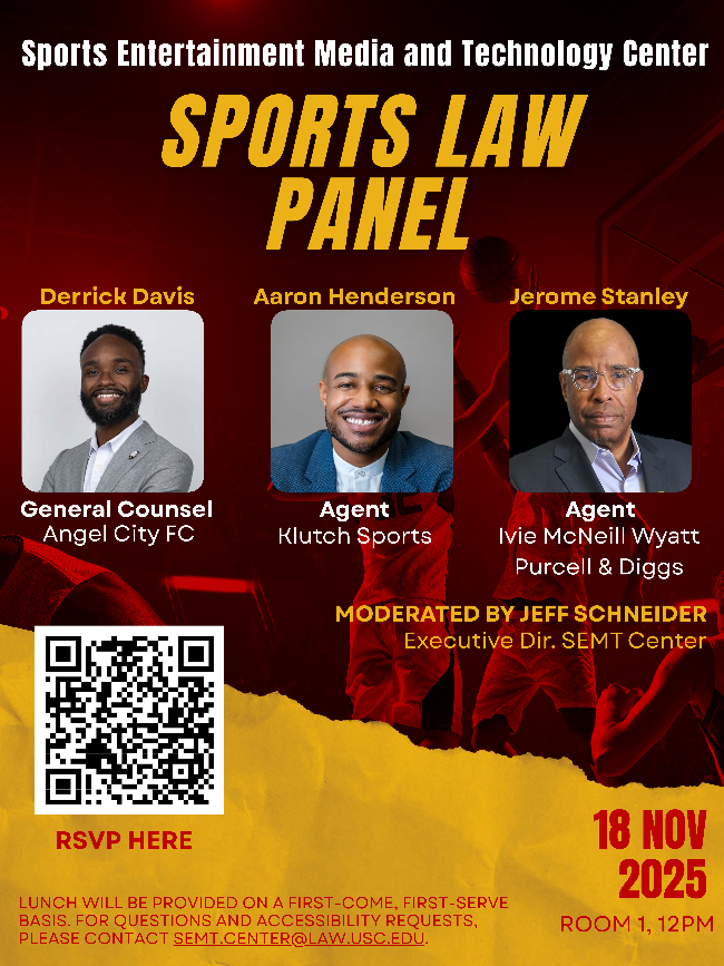 Join the Sports, Entertainment, Media, and Technology Law (SEMT) Center for an engaging discussion on the fast-paced world of sports law and athlete representation. Industry experts Derrick Davis (Angel City FC), Aaron Henderson (Klutch Sports), and Jerome Stanley (Ivie McNeill Wyatt Purcell & Diggs) will share insights on contracts, negotiations, and the evolving legal and business landscape of professional sports.