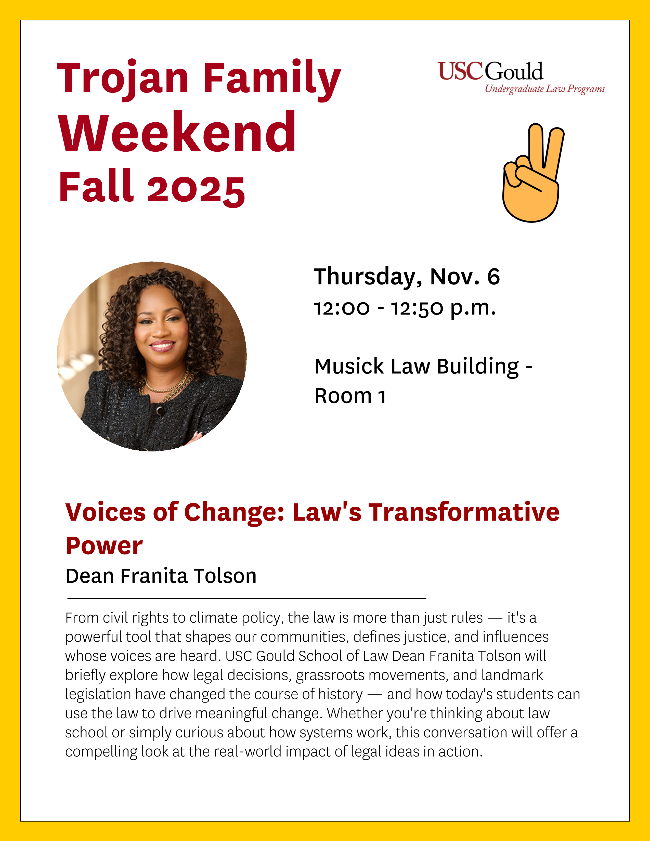 | | | | As part of Trojan Family Weekend, join USC Gould School of Law Dean Franita Tolson for an inspiring discussion on how the law influences the world around us - from civil rights to environmental policy. Dean Tolson will explore how legal decisions, landmark legislation, and grassroots movements have shaped history, and how today’s students can harness the law to create positive change. This engaging session invites students and families to see firsthand how legal ideas come to life and impact our communities. | | |