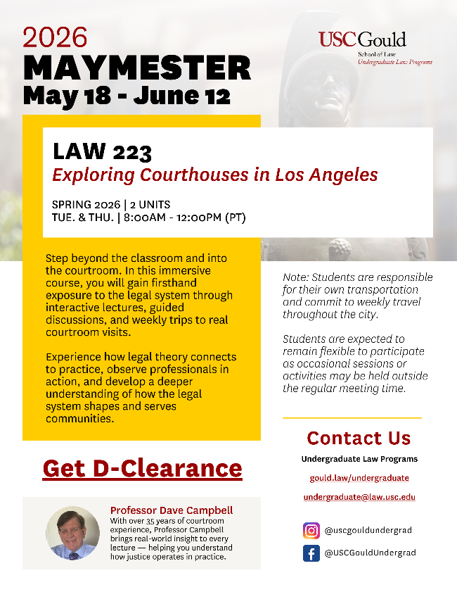 Experience law in action with Exploring Courthouses in Los Angeles! This Maymester course takes you beyond the classroom to examine the city's legal institutions up close. Learn how courts operate, meet legal professionals, and gain firsthand insight into the justice system - all while earning academic credit.