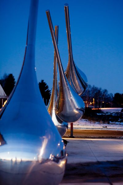 The site of Traveller's Return has a 5,000-year history as a place of interface between the Great Lakes, the world's oceans and western Canada. The droplet-shaped sculptures by Lethbridge-based artist Andy Davies are located on the pathway leading to Pier 3.