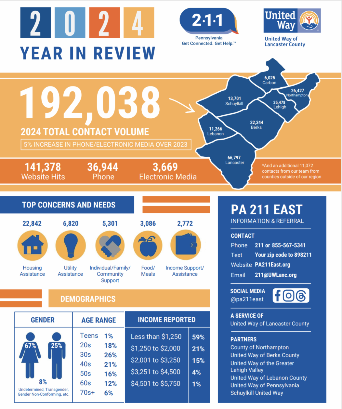 It’s been an impactful year for PA 211 East! We recorded our highest number of interactions for our region to date. Over 36,000 calls, nearly 4,000 texts/chats/emails and more than 141,000 web searches for community resources.